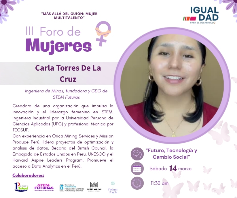 Ingeniera de Minas, fundadora y CEO de STEM Futuras Creadora de una organización que impulsa la innovación y el liderazgo femenino en STEM. Ingeniera Industrial por la Universidad Peruana de Ciencias Aplicadas (UPC) y profesional técnica por TECSUP. Con experiencia en Orica Mining Services y Mission Produce Perú, lidera proyectos de optimización y análisis de […]